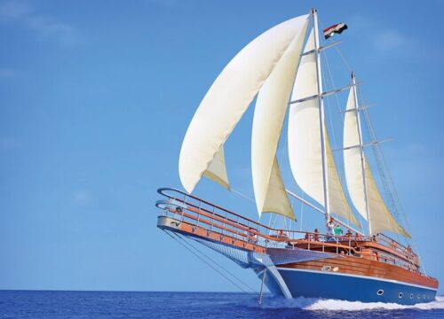 Step aboard one of the most elegant sailing vessels on the Red Sea for an unforgettable day combining luxury, adventure, and relaxation. These twin-masted wooden boats, designed in a classic pirate-ship style, feature a spacious upper sun deck for sunbathing and two beautifully decorated, air-conditioned indoor salons. Enjoy a unique open-buffet lunch in the stylish main salon while taking in the stunning sea views.